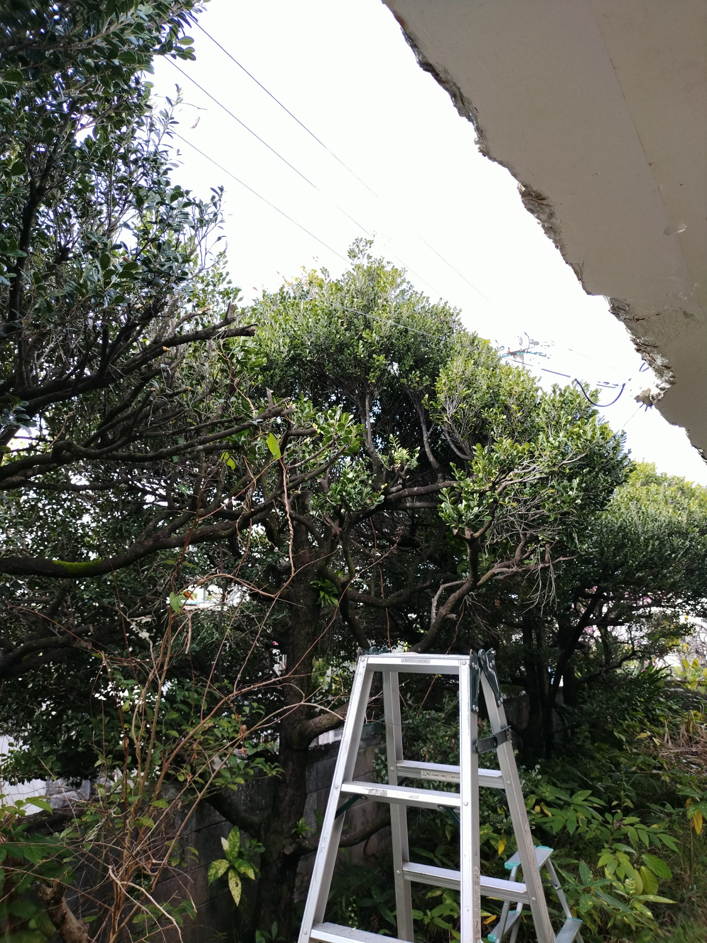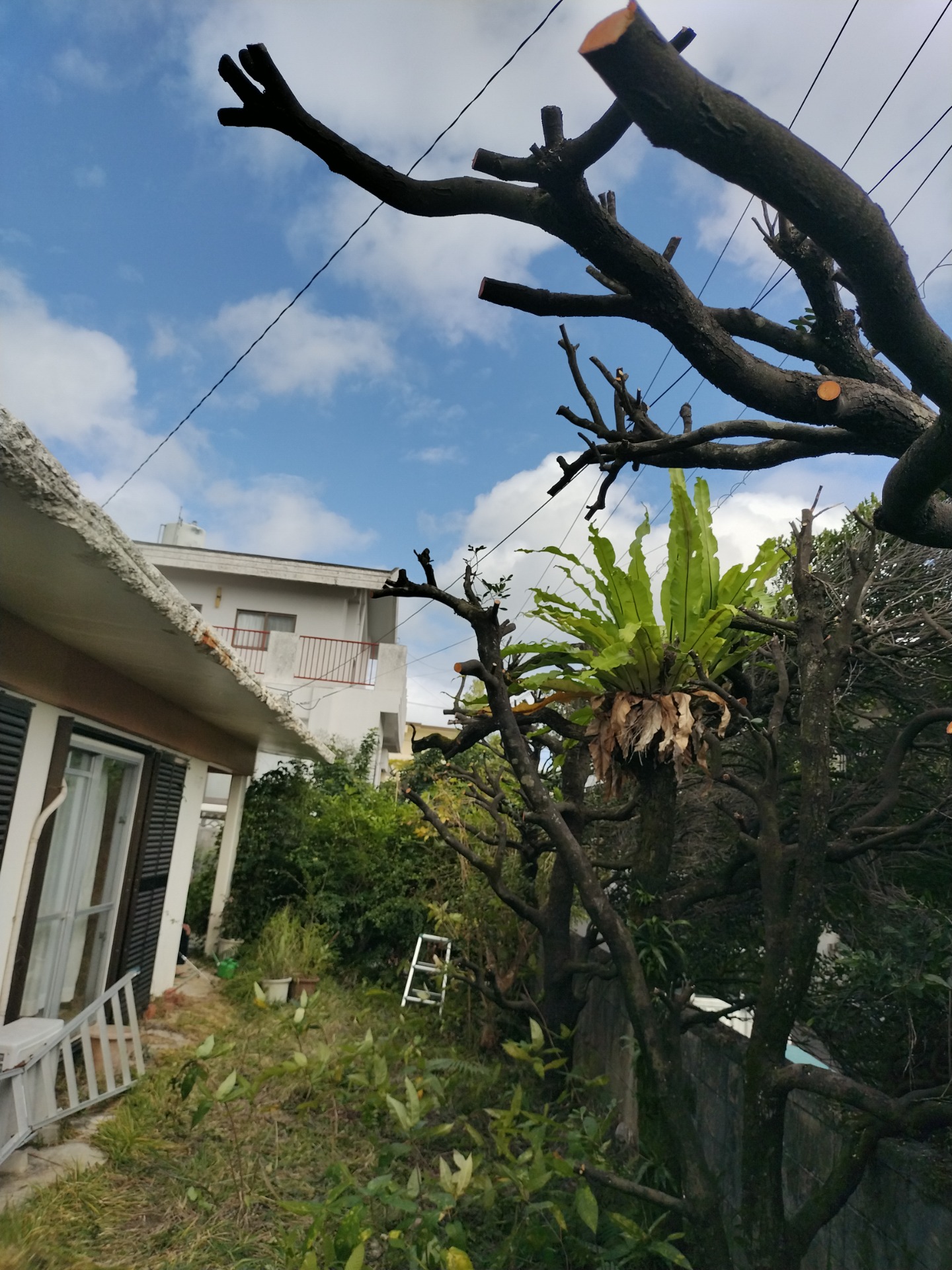 【作業内容】脚立ハシゴを使いハンドチェーンソーと高枝鋏とギア鋏で剪定伐採を行いました。